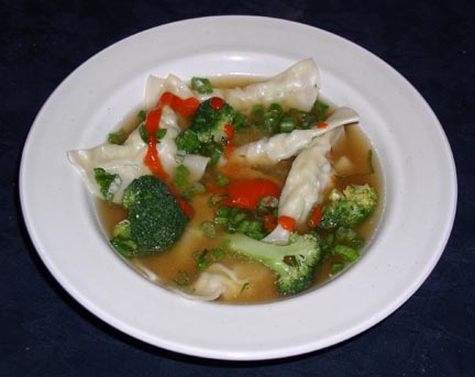 For the soup pictured, heat two cups per person of turkey or chicken broth, add a dash of soy sauce, chile flakes, salt, fish sauce, 5-spice etc. Defrost 4-5 dumplings per person in the stock (or place them in directly after cooking, at the end). Just before serving, right after the broth is boiling again, add 1/2 cup thawed or fresh peas per person and heat just until boiling again. Add 1/2 to 1 cup of bean sprouts per person and serve with dumplings.