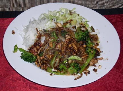 The bulk of this meal consists of fresh, barely cooked vegetables. To make this a satisfying main course, the stir-fry should maintain a crunchy and varied texture in the mouth. That means barely cooking the vegetables. In fact much of this can remain raw if you don't mind it cold. Timing is important.