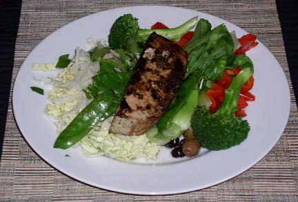 However, that doesn't mean I stopped cooking, and I continued to participate in the study. In fact I lost a total of about 20 pounds in 3 months. It takes about 30-60 minutes of actual effort to cook most of these meals, but it takes about 2-3 hours to ducument a recipe and add it to this journal. In a few cases, I did manage to take a quick photo if dinner turned out good, and I'll add them here at the end just to give some indication of the mix-and-match approach I take to cooking. You won't need recipes for these. They use variations upon ideas described above.