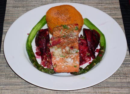 I coated two fillets of halibut with a crust of coriander, black pepper, dry parsley and a pinch of salt. After all the vegetables were done, these got seared on very high heat with a bit of olive oil until light brown outside, moist inside. For the veggies, I cut a few red and yellow beets and one small dark yam. I steamed these in a covered glass caserol in the microwave with a splash of vermouth for about 5 minutes. The bright orange beet juices colored the reduced vermouth and become the sauce underneath. I chopped up the beet greens and sautéed them on medium heat (in the pan later used for the fish) with a drop of olive oil and a clove of chopped garlic. I added a chopped head of baby bok choi halfway through. As soon as those vegetables left the pan onto the plates, I brought the heat up to sear the fish quickly. On top I sprinkled chopped green onions as a garnish.